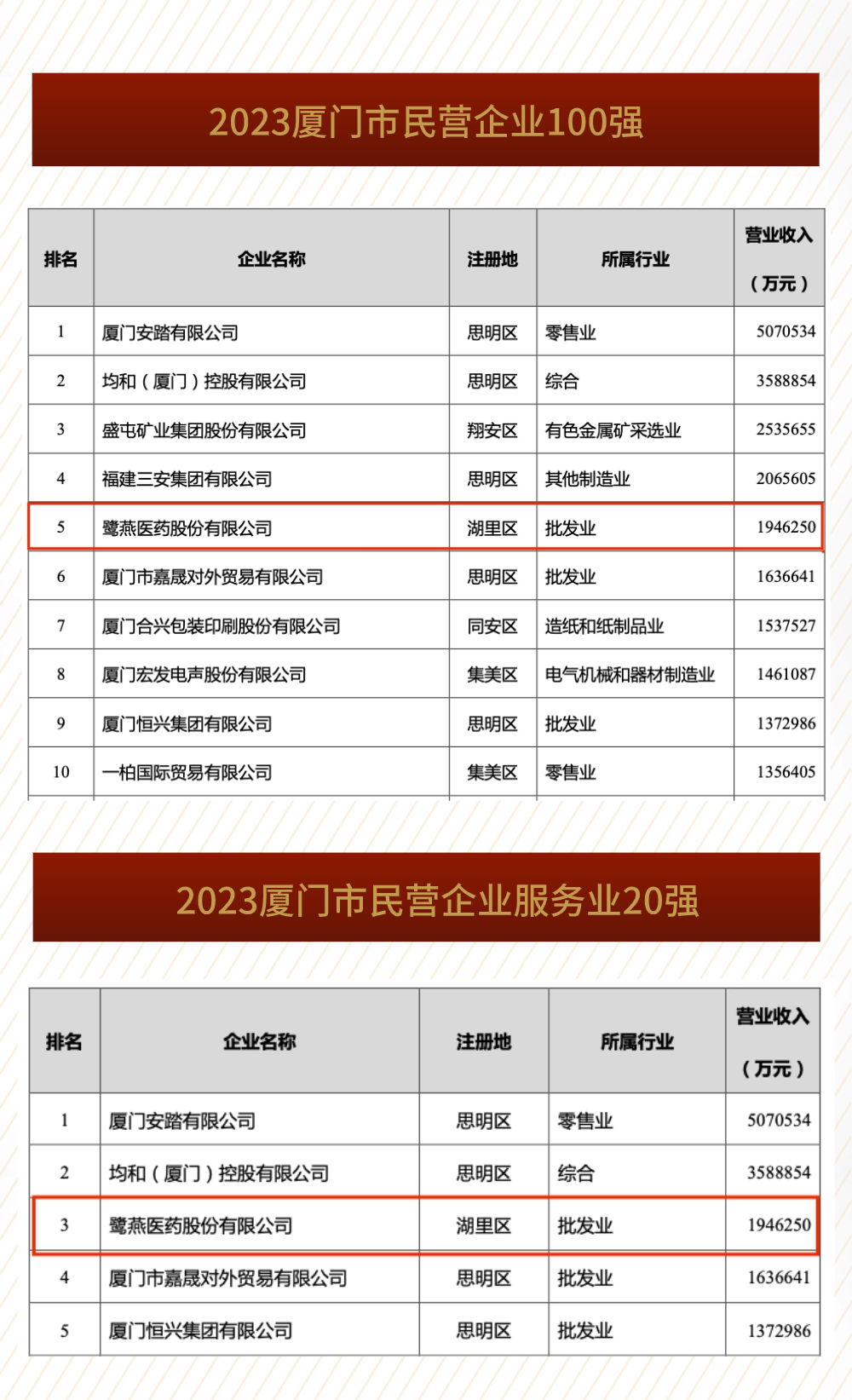 喜報(bào) | 鷺燕醫(yī)藥榮列2023廈門(mén)市民營(yíng)企業(yè)100強(qiáng)等系列榜單!