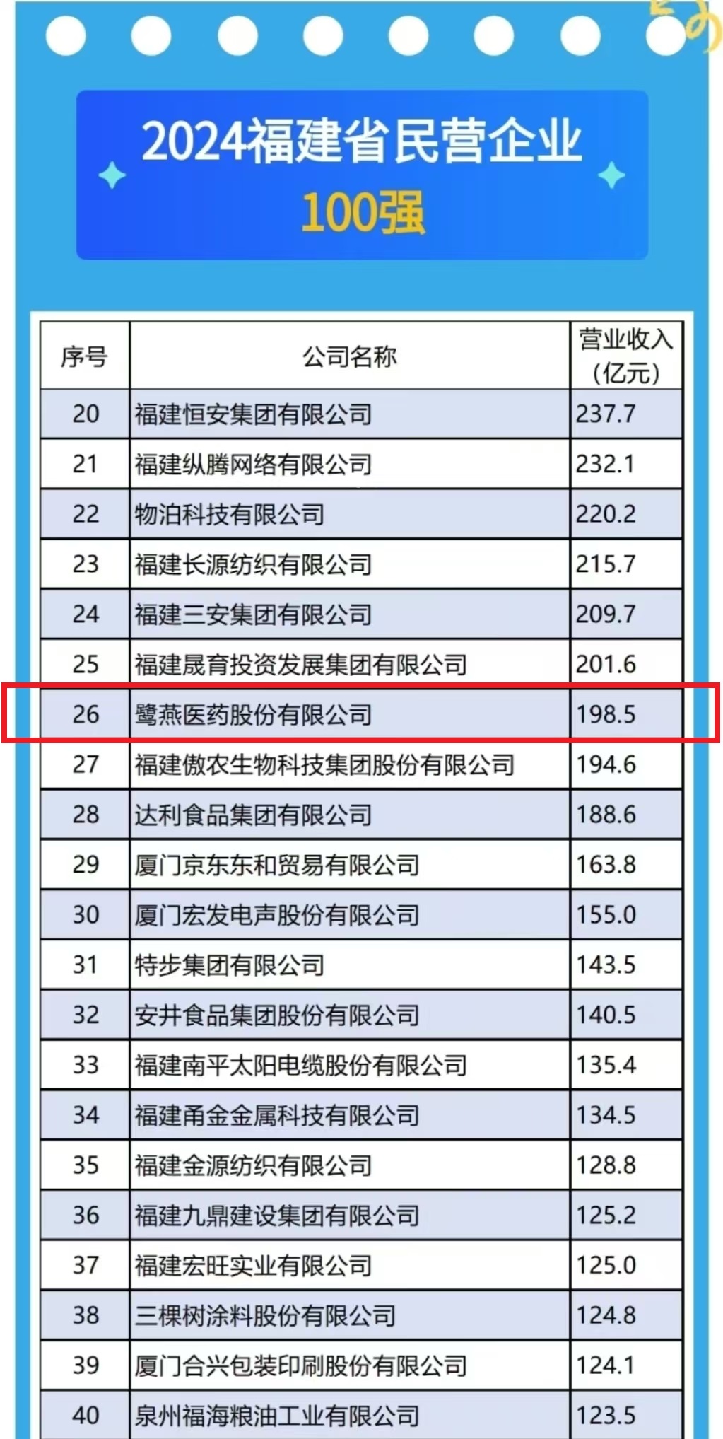 本月,福建省工商聯(lián)發(fā)布2024福建省民營企業(yè)100強、制造業(yè)民營企業(yè)100強、服務業(yè)民營企業(yè)100強、創(chuàng)新型民營企業(yè)100強和民營企業(yè)社會責任100佳5個榜單。鷺燕醫(yī)藥榮獲2024福建省民營企業(yè)100強第26位、福建省服務業(yè)民營企業(yè)100強第10位、福建民營企業(yè)社會責任100佳!