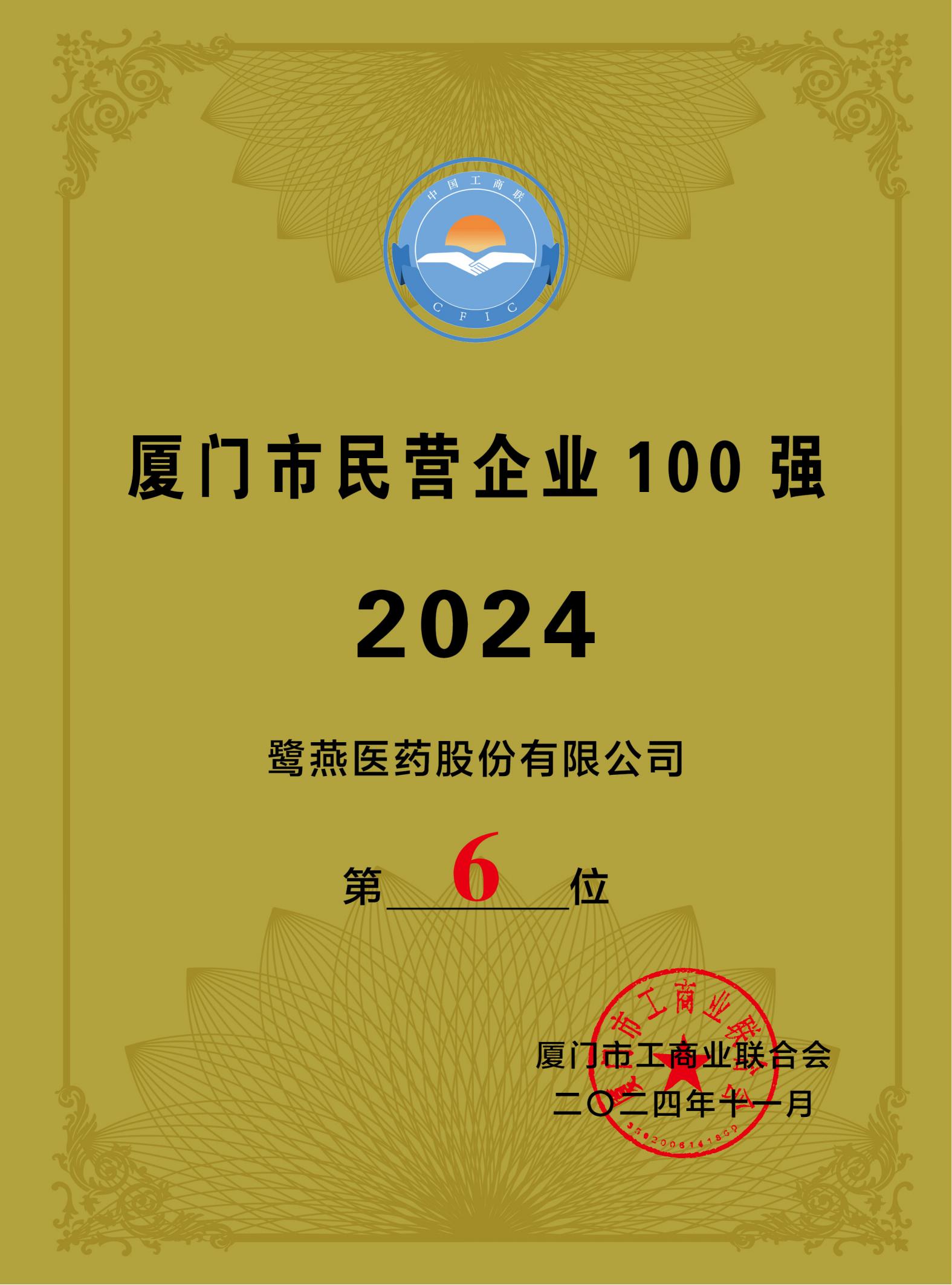 2024年廈門企業(yè)家日大會于11月1日召開,會上發(fā)布2024廈門市民營企業(yè)100強榜單、2024廈門市民營企業(yè)服務(wù)業(yè)20強榜單。鷺燕醫(yī)藥榮登2024廈門市民營企業(yè)100強榜單第6位,2024廈門市民營企業(yè)服務(wù)業(yè)20強榜單第4位!