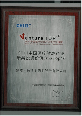 2011年7月14日,在北京舉辦的2011第五屆中國醫(yī)療健康產(chǎn)業(yè)投融資峰會上,鷺燕(福建)藥業(yè)股份有限公司榮獲“2011中國醫(yī)療健康產(chǎn)業(yè)最具投資價值企業(yè)TOP10”稱號。公司于2010年引進建銀國際醫(yī)療產(chǎn)業(yè)基金等投資者近1.5億元投資后,在公司治理、經(jīng)營業(yè)績、戰(zhàn)略布局等方面得到進一步提升,鞏固了公司在福建省醫(yī)藥流通領(lǐng)域的龍頭地位。
