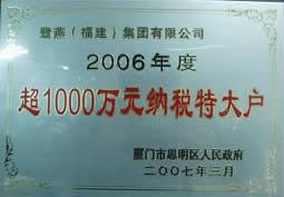 2007年3月9日,廈門市思明區(qū)在國(guó)際會(huì)展中心召開2006年度納稅大戶表彰大會(huì),鷺燕(福建)集團(tuán)喜獲“2006年度超1000萬(wàn)元納稅特大戶”榮譽(yù)稱號(hào)。